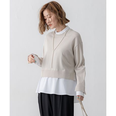 取り外せる襟がセットになったレイヤード風のニットプルオーバー。トレンド感のあるショートレングスのニットに、ゆとりのあるシャツテールが重ね着したようについています。袖下部分にはV字型のスリットにシャツ袖が見える仕様で、きれいめな印象も。1枚でレイヤードしているかのようなこなれたスタイルが完成するので、忙しい朝でもすぐにコーディネートが決まるのがうれしいポイント。カラーは、抜け感のあるグレー(#004)、印象引き締まるブラック(#005)、やわらかな雰囲気のベージュ(#033)の3色展開です。