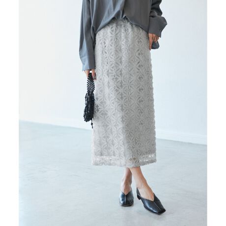 ・フラワー柄のチュールレースを用いたタイトスカート。