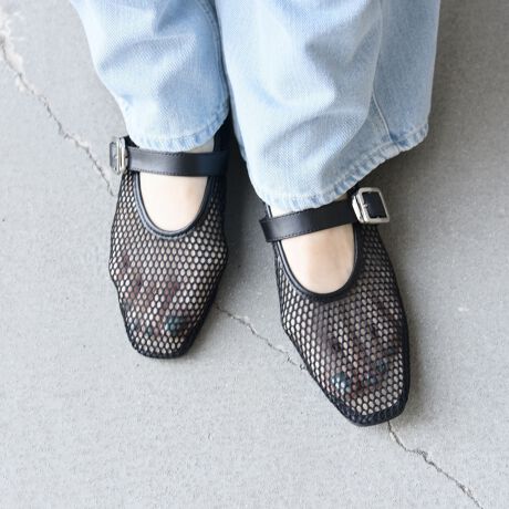 トレンドのメッシュ素材が目をひくフラットシューズ。