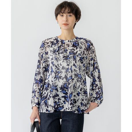 襟ぐりにピンタックとギャザーをふんだんにあしらったディテールが特徴のボリュームブラウスです。落ち感のある軽いシアー素材で作っているのでピンタックやギャザーのなじみが良く、華奢見えするのが嬉しいポイントです。同素材で作ったスカートと合わせてセットアップとして着用するのはもちろん、デニムやキレイめのボトムとも合わせやすく、汎用性の高い1枚です。ニュアンスのあるイエローが差し色に入ったダークグリーンプリント(#565)とブルーが差し色に入った爽やかなネイビープリント(#575)の2色展開です。