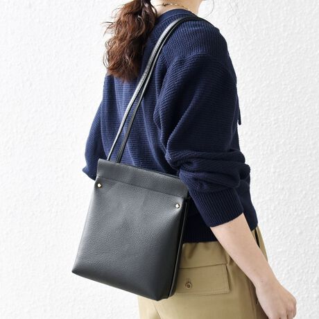コーデに馴染みつつ、適度な存在感もプラスしてくれる、スクエア型のポシェット。