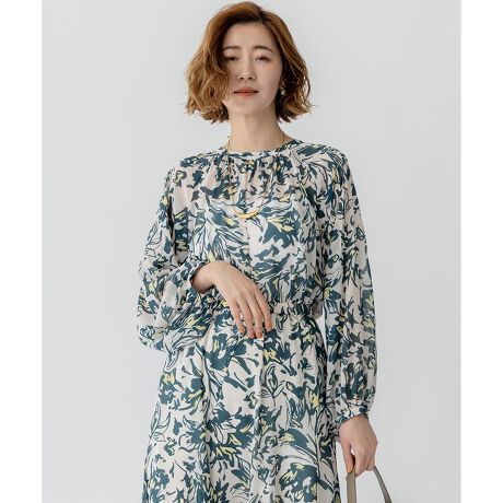 襟ぐりにピンタックとギャザーをふんだんにあしらったディテールが特徴のボリュームブラウスです。落ち感のある軽いシアー素材で作っているのでピンタックやギャザーのなじみが良く、華奢見えするのが嬉しいポイントです。同素材で作ったスカートと合わせてセットアップとして着用するのはもちろん、デニムやキレイめのボトムとも合わせやすく、汎用性の高い1枚です。ニュアンスのあるイエローが差し色に入ったダークグリーンプリント(#565)とブルーが差し色に入った爽やかなネイビープリント(#575)の2色展開です。