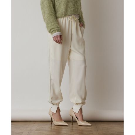 綺麗めに穿いていただける旬顔ジョガーパンツ。レッグラインがほっそり見えるよう、あえてやや細いシルエットに仕上げた拘りの一本です。 サイドは細いサテンのコードパイピングを2本入れて、裾はリブ仕立てに。さらにフロントスリットを入れ、スポーティーな雰囲気と女性らしさを楽しめるデザインに仕上げました。ウエストはドロストデザインにしたストレスのない楽な穿き心地。ゴツめの厚底ブーツでカジュアルに纏めるのはもちろんの事、パンプスを添えた時にもバランス良く合わせて頂けます。定番のブラックに加え、シーズンスタイルにぴったりな春色ピンク&キナリの3色をご用意しました。