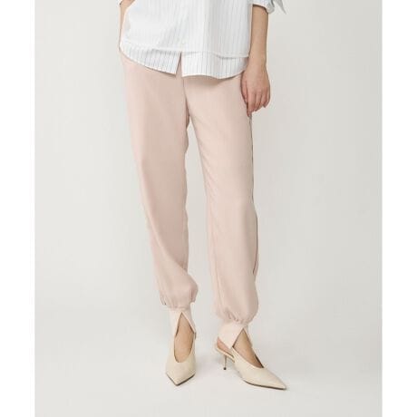 綺麗めに穿いていただける旬顔ジョガーパンツ。レッグラインがほっそり見えるよう、あえてやや細いシルエットに仕上げた拘りの一本です。 サイドは細いサテンのコードパイピングを2本入れて、裾はリブ仕立てに。さらにフロントスリットを入れ、スポーティーな雰囲気と女性らしさを楽しめるデザインに仕上げました。ウエストはドロストデザインにしたストレスのない楽な穿き心地。ゴツめの厚底ブーツでカジュアルに纏めるのはもちろんの事、パンプスを添えた時にもバランス良く合わせて頂けます。定番のブラックに加え、シーズンスタイルにぴったりな春色ピンク&キナリの3色をご用意しました。