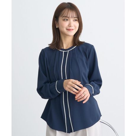 手触りの滑らかな素材で仕立てたブラウス。襟元にタックを入れた程よいフレアシルエットで体のラインを拾いにくく、シンプル&シックなデザインで上品な印象に仕上げました。パイピングデティールが着映えるアクセント。オフィスシーンやデイリー使いはもちろん、オケージョンスタイルにも活躍するアイテムです。