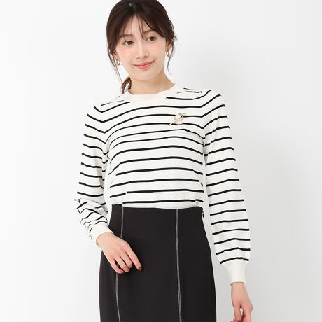 エレガントなアクセントをプラスするブローチ付きのラメバリエーションニット。ラメの繊細な輝きと柔らかなふくらみのあるスリーブが、さりげなく華やかな印象を演出。普段使いはもちろん、仕事やデートなどの様々なシーンにも活躍してくれるアイテムです。■fabric透け感[やや有り]裏地[無し]伸縮性[有り]生地の厚さ[普通]