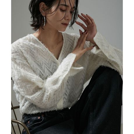 カットジャガードの華やかな表面感とVネックのシャープな印象がベストバランスな1枚。
