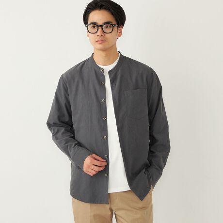 ポリエステルフェイクスエードの素材を使用したバンドカラーシャツ。
