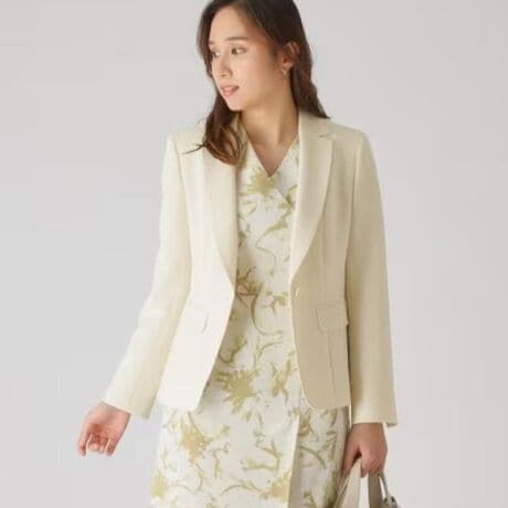 ノーカラージャケット(品番187−42210)よりも少し長めの着丈なのでパンツとのスタイリングがとくに好相性です。