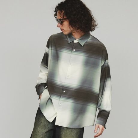 ランダムな太さのグラデーションオンブレー柄が特徴のシャツ。