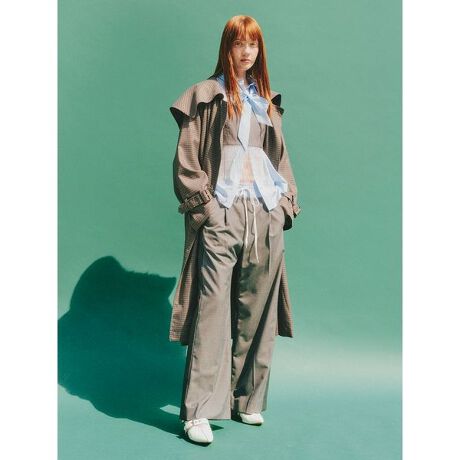トラッドな雰囲気のトレンチコートを、FURFURらしく大きなセーラーカラー風の襟やオーバーなサイズ感でフェミニンな印象にアレンジしたコート。ウエストは内側にドロスト紐を入れているので、シルエットを絞ってウエストにフィットさせたりと変化も楽しめます。大きめサイズで冬に厚手のニットもインナーに着用でき、長い期間楽しめるアウターです。