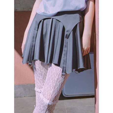 バレエコアの要素を取り入れたスカートとパンツのセットアイテム。ガーター付きのスカートはフレアとハンカチーフヘムのディテールで動きを出し、インナーパンツは足を美しく見せる裾フレアシルエットになっています。光沢あるサテン生地がスタイリッシュな印象を演出します。