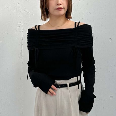 ドロストを寄せたオフショルは身頃をスッキリと見せてくれます。