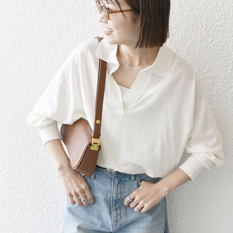 今季らしいスキッパーネックのポロシャツ。