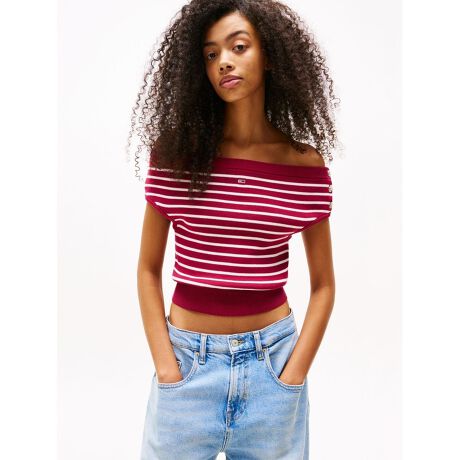 マリンテイスト薫る、ストライプ柄のクロップド丈セーター。オフショルダーデザインで、フェミニンなエッセンスを加えました。