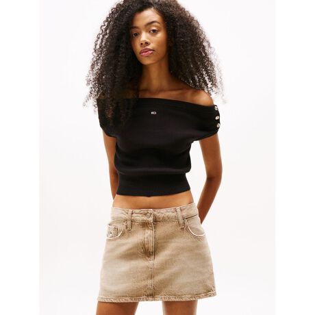 フロントネックには小さなフラッグロゴを、左肩にはマリンウェアの象徴となるゴールドボタンをアクセントでオン。コンパクトなサイズ感は、バランスの良い着こなしを後押しします。ハイライズボトムにぴったりの一枚です。
