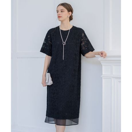繊細な柄が美しいレースを贅沢に使用したブラックドレス。ストレートシルエットのシンプルな形をベースに、裾にシアー素材を重ねてレイヤードしてみせることで、クラシカルな雰囲気に奥行き感と程よく旬な雰囲気を加えたデザインです。