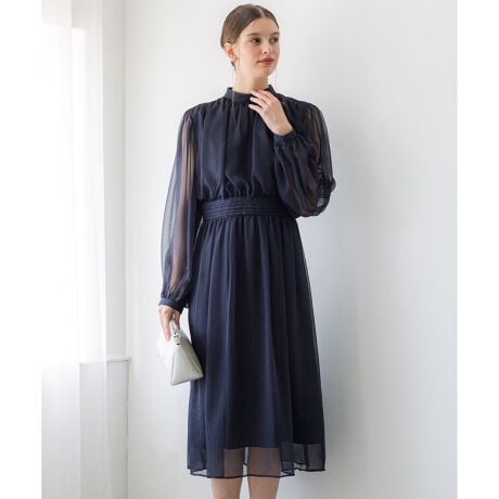 さりげなくラメ糸が煌めく軽やかな素材感を活かした流れるようなシルエットが魅力のドレス。襟元や袖口、ウエスト部分にタックを入れ、贅沢に分量をもたせながら着用時にはすっきりとした印象になるように仕上げています。清楚でエレガントなシャンパン(#033)、気品を感じるネイビー(#075)の2色展開です。