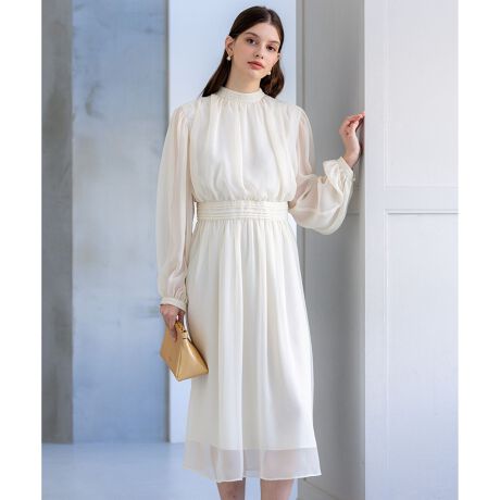 さりげなくラメ糸が煌めく軽やかな素材感を活かした流れるようなシルエットが魅力のドレス。襟元や袖口、ウエスト部分にタックを入れ、贅沢に分量をもたせながら着用時にはすっきりとした印象になるように仕上げています。清楚でエレガントなシャンパン(#033)、気品を感じるネイビー(#075)の2色展開です。