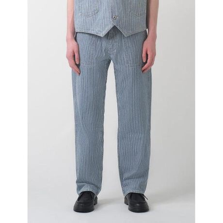リラックス感のあるゆったりとしたストレートフィットのユーティリティパンツ。ワークテイストの雰囲気満載のヒッコリーストライプ柄、サイドにハンマーループも配し、ワーク要素も取り入れているのが特徴です。ポケットのアーキュエイトステッチも取り除きシンプルなデザインになっています。普段穿くのは勿論、作業着としても活躍する一本です。