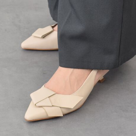 ノットオーナメントが印象的なバックバンドパンプスはシンプルなデザインで様々なスタイリングにマッチする一足です。