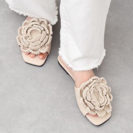 大きなフラワーオーナメントが印象的なフラットスライドサンダルです。