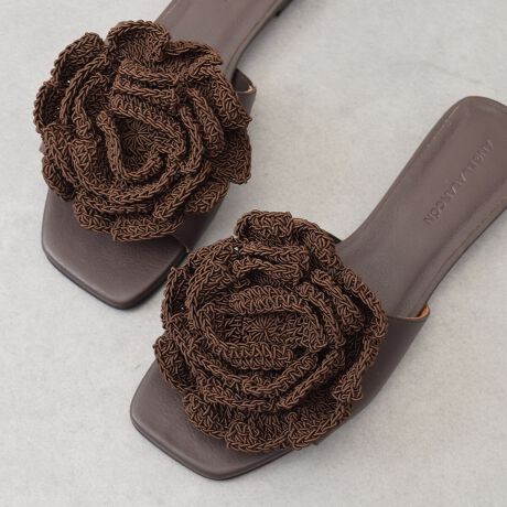 大きなフラワーオーナメントが印象的なフラットスライドサンダルです。