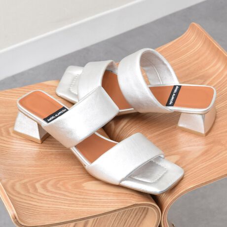スクエアトウのチャンキーヒールサンダルは袋状に縫われたアッパーのソフトな質感が特徴的な一足。