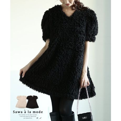 【ワンピース】 チュニック 黒 ブラック オフホワイト 半袖 ミニ丈 シャギー ファー パフスリーブ