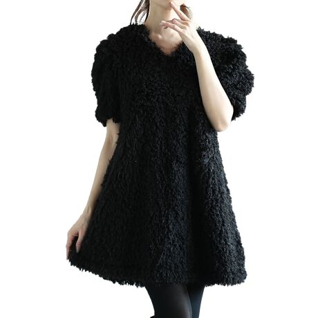 【ワンピース】 チュニック 黒 ブラック オフホワイト 半袖 ミニ丈 シャギー ファー パフスリーブ