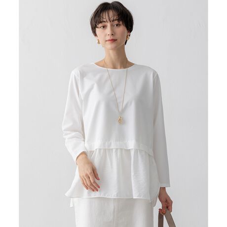 しなやかなシャツテールシルエットのコンビカットソー。肩が少しドロップしたほど良い抜け感のボディに、ウエストからギャザーを入れ、ヒップ回りが張りつかないように仕上げました。一枚で着るのはもちろん、ジャケットやカーディガンを羽織って裾のデザインをワンポイントにしても、クロップド丈のカットソーやニットのインナーとして裾をレイヤードさせてもバランスよく決まります。さまざまなスタイルにマッチし、つい毎日手に取りたくなる便利なアイテムです。カラーは清潔感のあるホワイト(#001)、印象が引き締まるブラック(#005)、やわらかな雰囲気のベージュ(#033)の3色展開です。