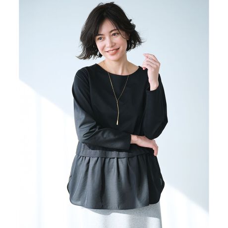 しなやかなシャツテールシルエットのコンビカットソー。肩が少しドロップしたほど良い抜け感のボディに、ウエストからギャザーを入れ、ヒップ回りが張りつかないように仕上げました。一枚で着るのはもちろん、ジャケットやカーディガンを羽織って裾のデザインをワンポイントにしても、クロップド丈のカットソーやニットのインナーとして裾をレイヤードさせてもバランスよく決まります。さまざまなスタイルにマッチし、つい毎日手に取りたくなる便利なアイテムです。カラーは清潔感のあるホワイト(#001)、印象が引き締まるブラック(#005)、やわらかな雰囲気のベージュ(#033)の3色展開です。