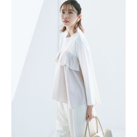 ビスチェをレイヤードしているかのようなデザインのカットソー。胸もとから2段にティアードでタックフレアーを出し、裾もジグザグとしたイレギュラーなシルエットなので甘さを抑えて大人っぽく着こなせます。ビスチェ部分と同素材のジャケットやワイドパンツと合わせたカラー展開なのでセットアップとして着れば、今年らしいスタイリングに。アウターを羽織ってもアクセントに、もちろん1枚でもシルエットを楽しめる、表情感のある一枚です。カラーは、抜け感のあるライトグレー(#003)、コントラストが際立つブラック(#005)、やわらかな印象のベージュ(#033)、洒落感のあるネイビー(#075)の4色展開です。
