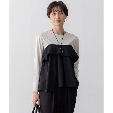 ビスチェをレイヤードしているかのようなデザインのカットソー。胸もとから2段にティアードでタックフレアーを出し、裾もジグザグとしたイレギュラーなシルエットなので甘さを抑えて大人っぽく着こなせます。ビスチェ部分と同素材のジャケットやワイドパンツと合わせたカラー展開なのでセットアップとして着れば、今年らしいスタイリングに。アウターを羽織ってもアクセントに、もちろん1枚でもシルエットを楽しめる、表情感のある一枚です。カラーは、抜け感のあるライトグレー(#003)、コントラストが際立つブラック(#005)、やわらかな印象のベージュ(#033)、洒落感のあるネイビー(#075)の4色展開です。