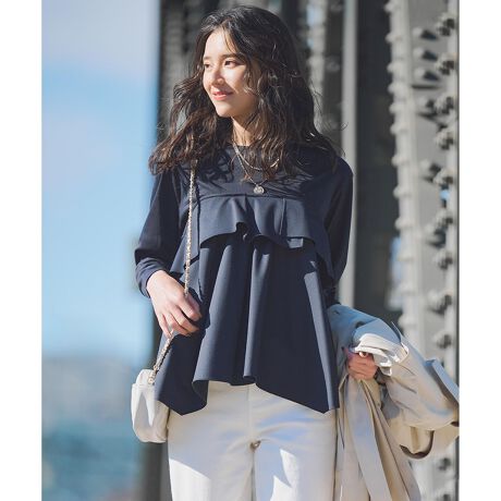 ビスチェをレイヤードしているかのようなデザインのカットソー。胸もとから2段にティアードでタックフレアーを出し、裾もジグザグとしたイレギュラーなシルエットなので甘さを抑えて大人っぽく着こなせます。ビスチェ部分と同素材のジャケットやワイドパンツと合わせたカラー展開なのでセットアップとして着れば、今年らしいスタイリングに。アウターを羽織ってもアクセントに、もちろん1枚でもシルエットを楽しめる、表情感のある一枚です。カラーは、抜け感のあるライトグレー(#003)、コントラストが際立つブラック(#005)、やわらかな印象のベージュ(#033)、洒落感のあるネイビー(#075)の4色展開です。