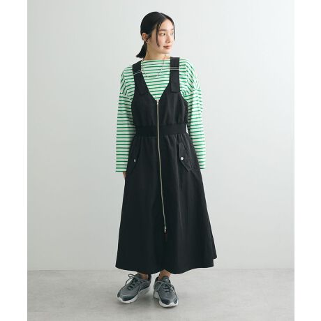 カジュアルに着こなすミリタリーライクなジャンパースカート。伸びの良いリブ仕様のウエストでシルエットにメリハリを効かせた女性らしいデザインです。スウェットやニットなど厚手のトップスもインしやすい幅広のアームホールもポイント。フロントのダブルジップで様々なアレンジスタイルを楽しめるおすすめのアイテムです。透け感[なし]