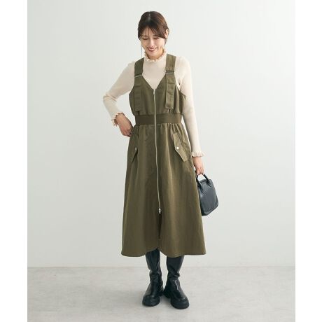 カジュアルに着こなすミリタリーライクなジャンパースカート。伸びの良いリブ仕様のウエストでシルエットにメリハリを効かせた女性らしいデザインです。スウェットやニットなど厚手のトップスもインしやすい幅広のアームホールもポイント。フロントのダブルジップで様々なアレンジスタイルを楽しめるおすすめのアイテムです。透け感[なし]