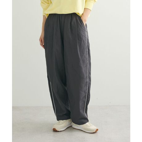 腰回りのタックディテールで丸みのあるラインを演出したコクーンシルエットパンツ。ユーテスポーティーカジュアルなポリエステル生地を使用し、ライトな穿き心地なのも嬉しい仕立てです。サイドラインの配色パイピングが今年らしいさりげないアクセント。スタイリングの幅が広く、デイリーに活躍してくれるユーティリティーな一本です。透け感[なし]