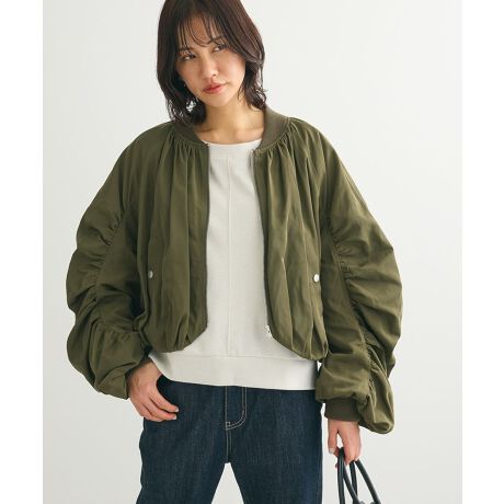 ミリタリーなMA-1をフェミニンに仕上げた旬のアイテム。コンパクト丈で丸みのあるフォルムが女性らしいデザインです。大きくボリュームを付けた特徴的な袖にポイントギャザーでさらに甘さをプラス。ドロスト入りのラウンドカットヘムでより存在感のあるフォルムにアレンジも可能です。透け感[なし]