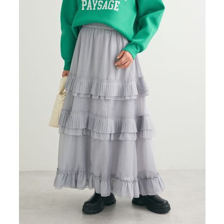 きれいめにもカジュアルにも相性の良いデザインフリルスカート。シアーの程よい透け感が柔らかな印象を加え、華やかに演出してくれます。ティアードラインにはプリーツを重ねて存在感たっぷりに。ウエストシャーリングゴムでリラクシーに着用出来、スタイリングがしやすいのも嬉しいポイントです。透け感[ややあり]