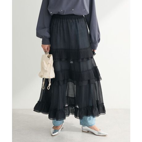 きれいめにもカジュアルにも相性の良いデザインフリルスカート。シアーの程よい透け感が柔らかな印象を加え、華やかに演出してくれます。ティアードラインにはプリーツを重ねて存在感たっぷりに。ウエストシャーリングゴムでリラクシーに着用出来、スタイリングがしやすいのも嬉しいポイントです。透け感[ややあり]