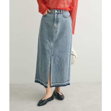 ウォッシュド加工のライトなカラーが魅力的なデニムスカート。フロントに深めのスリットを施したロングストレートのスタイリッシュなシルエットがポイントです。裾のアウトラインはカットオフでカジュアルな抜け感をプラス。バックゴム仕様で楽に着用出来、デイリーに合わせられるおすすめのアイテムです。透け感[なし]