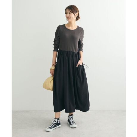 着心地良いリブ素材にやや光沢とシャリ感のある生地をドッキングしたバイカラーワンピース。ウエスト切り替えでふんわりとボリュームを出した女性らしいシルエットが魅力的な1枚です。ドロストコード付きの大きなポケットはスタイルに合わせてシルエットアレンジが可能。ルーズにもスタイリッシュにも着こなせるおすすめのアイテムです。透け感[なし]