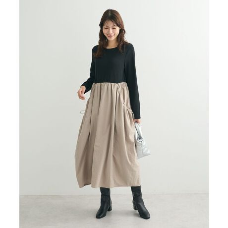 着心地良いリブ素材にやや光沢とシャリ感のある生地をドッキングしたバイカラーワンピース。ウエスト切り替えでふんわりとボリュームを出した女性らしいシルエットが魅力的な1枚です。ドロストコード付きの大きなポケットはスタイルに合わせてシルエットアレンジが可能。ルーズにもスタイリッシュにも着こなせるおすすめのアイテムです。透け感[なし]