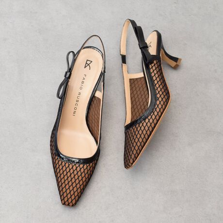 チュール素材の透け感がヌーディーかつフェミニンなバックバンドパンプスが「ファビオルスコーニ」から登場しました。