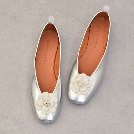 カメリアモチーフのデザインが印象的なラウンドトウのVカットバレエシューズが「ファビオルスコーニ」から登場しました。