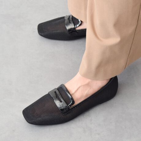 スクエアトウのフラットローファーはメッシュの素材感が涼しげな一足。