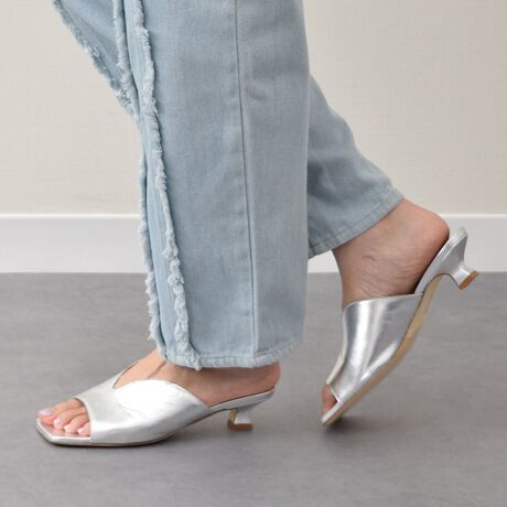 スリットデザインのミュールサンダルはワイドなスクエアトウとスプールヒールのフォルムがモダンな雰囲気です。