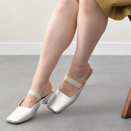 シンプルなデザインのスクエアトウミュールは、甲部エラスティックバンド仕様。ミニマルなフォルムがモダンな雰囲気です。