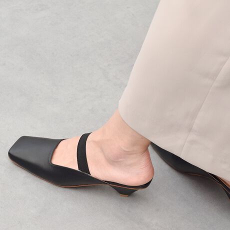 シンプルなデザインのスクエアトウミュールは、甲部エラスティックバンド仕様。ミニマルなフォルムがモダンな雰囲気です。